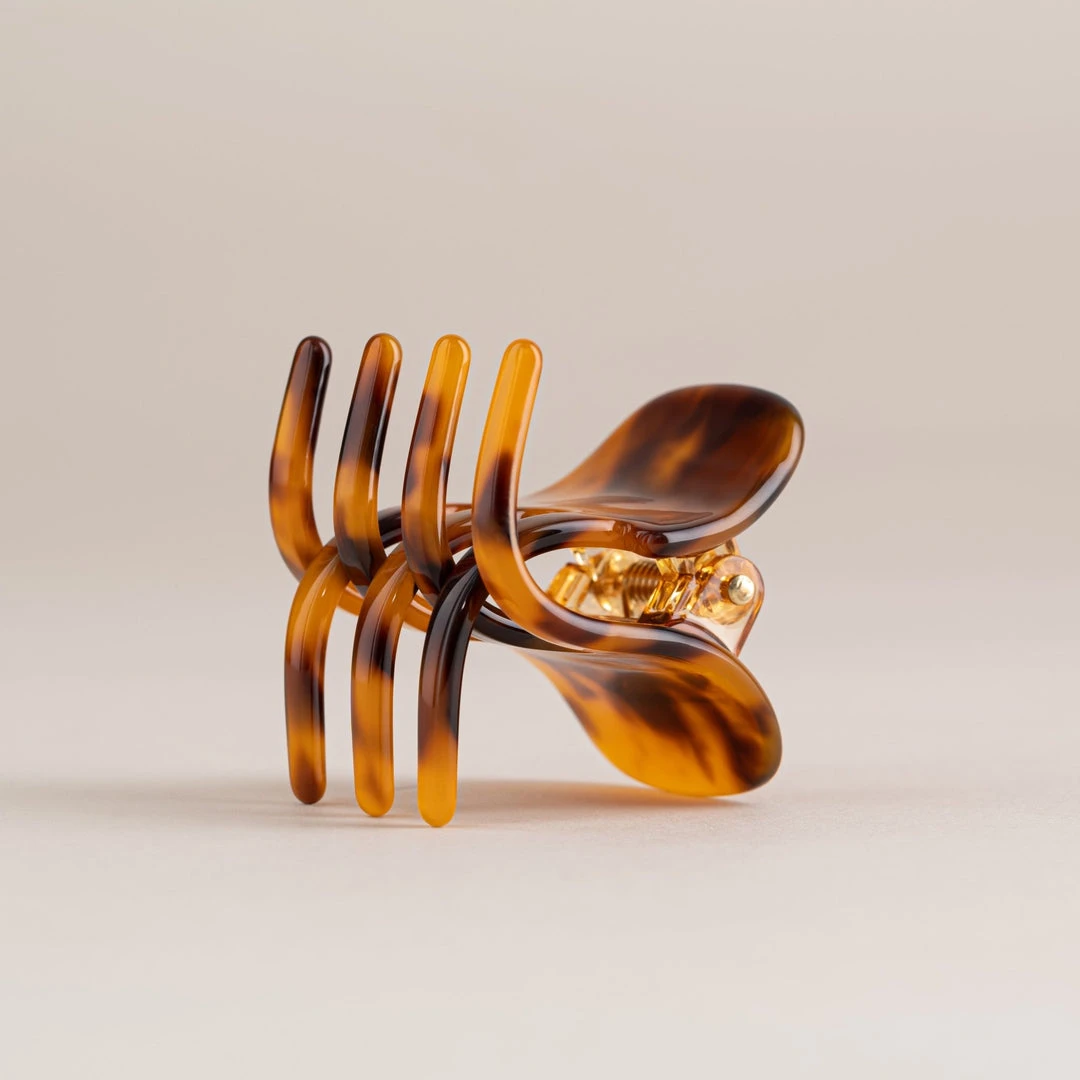 The model wears 2 of our Mini Claws in Canyon Brown.