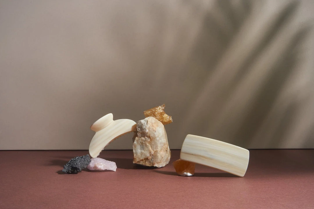 The model wears our Grande Claw in Blonde Tortoise.