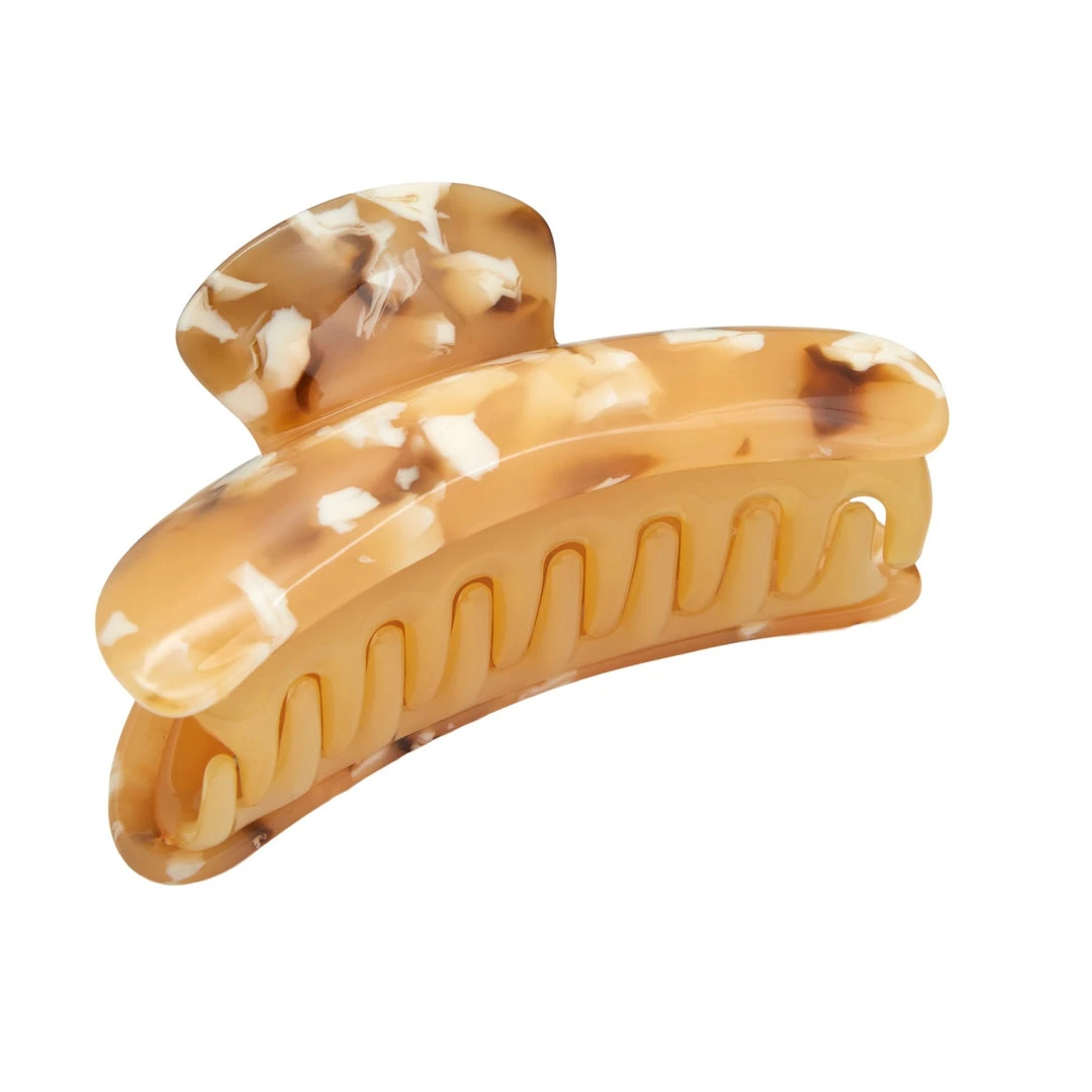 The model wears our Grande Claw in Blonde Tortoise.