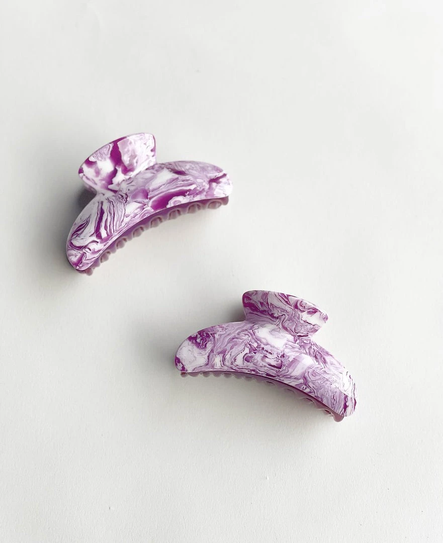 The model wears our Grande Claw in Blonde Tortoise.