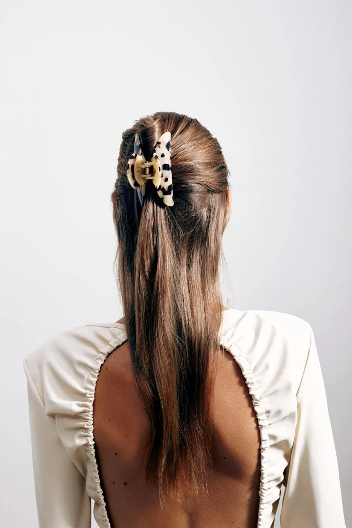 The model wears our Grande Claw in Blonde Tortoise.