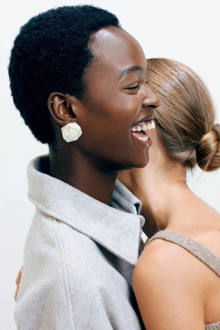 The model wears our Sculpture Studs in Ivory.