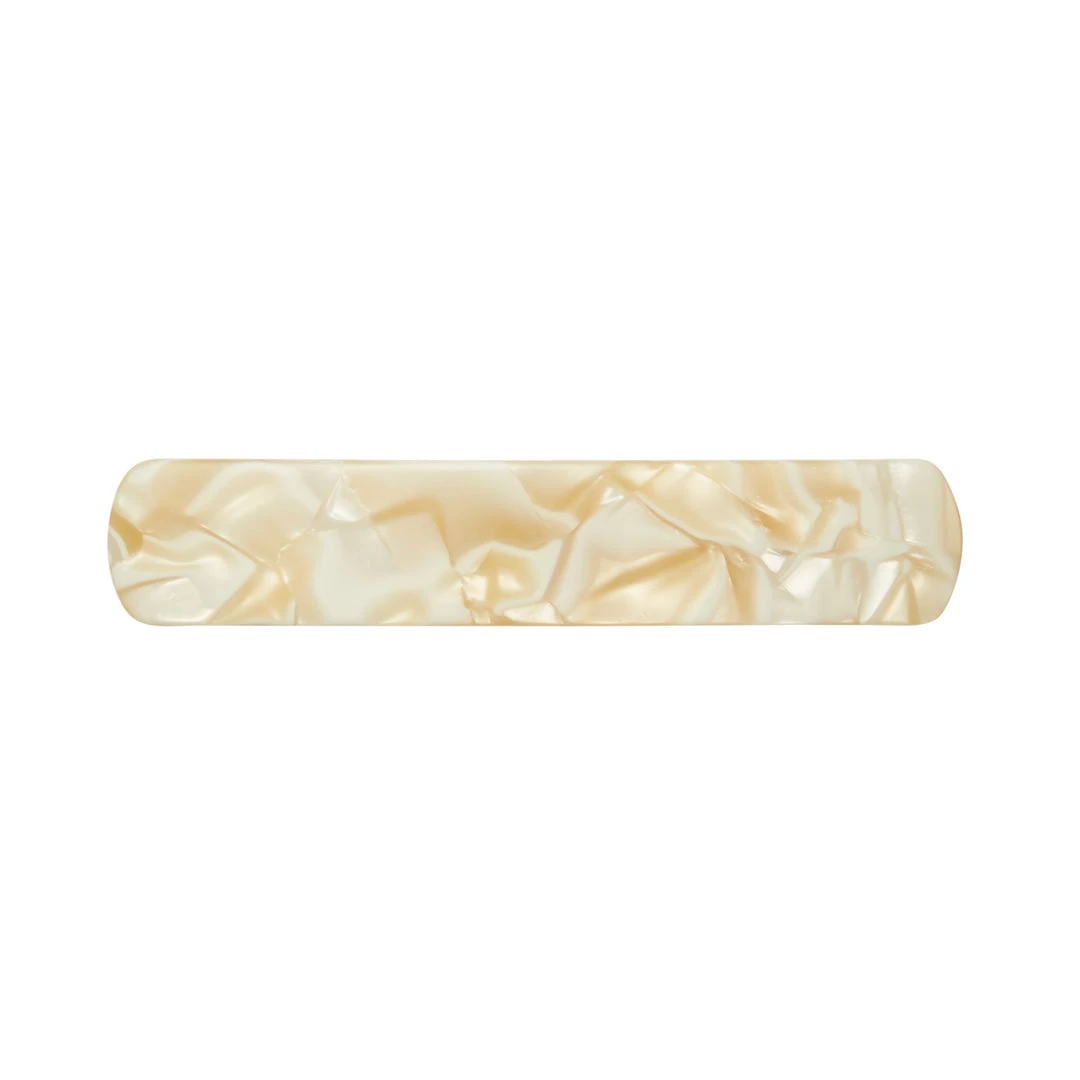 The model wears our (from top to bottom) No. 3 Heirloom Clip in Alabaster, Bizarre Checker, and Cognac.