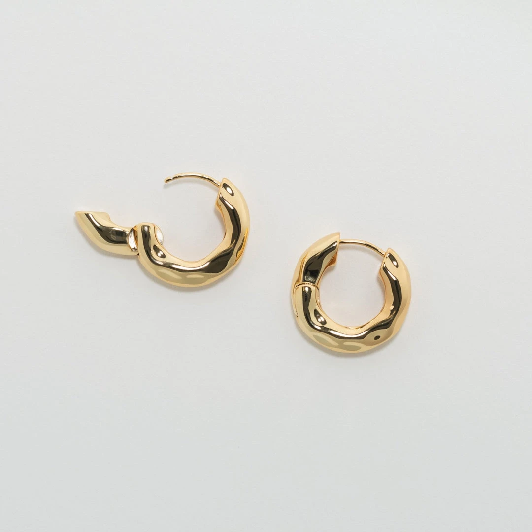 - Hinge-style hoop in gold and rhodium plated recycled brass. Measures approximately 1″ in diameter.